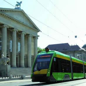 Tramino to w 100% niskopodłogowy tramwaj składający się z pięciu członów. Dzięki szynom na ścianach bocznych, do których mocowane są siedzenia, ich układ można łatwo zmieniać. - Wzór cyfrowy PAINT SPLATTER / producent: Shattdecor, projekt: dział Design Schattdecor AG pod kierownictwem Claudii Kuechen