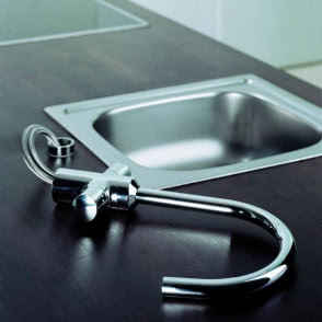 Do najciekawszych wariantów należy bateria Kludi Bingo Star ze złączem Bajonett - idealna, jeśli chcemy zamontować zlewozmywak pod oknem. Dzięki złączu, jednym ruchem wyciągniemy baterię z cokołu, położymy na blacie i wygodnie otorzymy lub zamkniemy okno.