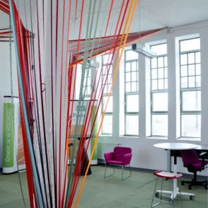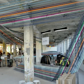 Instalacja kojarzy się z produkcją tkanin - dawnym znakiem rozpoznawczym Łodzi, a przy tym jest lekka, ażurowa i wyrazista. Nie konkuruje z innymi elementami tego charakterystycznego wnętrza - surową poprzemysłową halą, z dużymi przeszkleniami i lasem żelbetowych słupów.