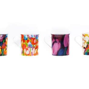 Designer Collection tworzą dwa zestawy po 4 kubki - każdy ozdobiony reprodukcjami obrazów jednego z malarzy. Na kubkach z obrazami Beaty Murawskiej widnieją kolorowe, kobiece i pełne życia kwiaty. Te Mikołaja Kasprzyka są w stonowanych barwach i przedstawiają żonglerów, muzyków i tancerzy, sylwetki jakby wycięte z renesansowych obrazów.