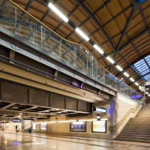 Ciekawym rozwiązaniem jest wykorzystanie zadaszenia dawnego peronu jako pasażu handlowego otwartego na halę główną. Zabieg ten wizualnie przybliża poziom piętra pasażerom i zachęca ich do przejścia w kierunku części komercyjnej.