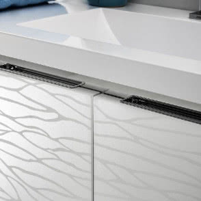 Nowoczesne i wyraziste dzięki sile kontrastu czerni i bieli oraz błyszczących i matowych elementów. Meble łazienkowe Pacific zwracają uwagę ciekawymi dekorami frontów - na matowej, białej lub czarnej, powierzchni widoczny jest błyszczący rysunek przypominający refleksy na tafli wody. W połączeniu z prostą linią białych korpusów szafek wyglądają bardzo efektownie.