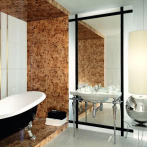 Kolekcja Monako stawia na przepych - tekstura i kolor płytek przypominają nieco tajemnicze wnętrze bursztynu, uzupełnieniem są szlachetna biel i czerń oraz złocenia. Całość daje poczucie, że zanurzamy się w luksusie.