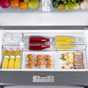Często używane produkty ułożymy tymczasem w pojemnej szufladzie (39 l) z ruchomymi przegródkami, które pozwalają utrzymać idealny porządek, bo produkty nie przesuwają się i nie mieszają ze sobą. Na dodatek w szufladzie możemy ustawić optymalną temperaturę do przechowywania: mięsa (-1°C), zimnych napojów (+1°C), przekąsek (+3°C) albo wina (+5°C).
