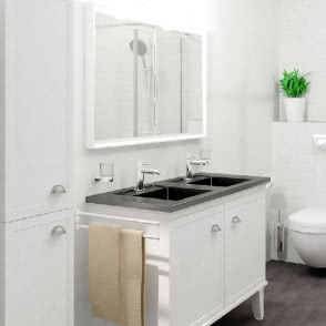 Białe proste szafki wyglądają stylowo, a przy tym bardzo współcześnie. Nawet uchwyty mają tradycyjną formę i nowoczesne satynowe wykończenie. Dzięki temu meble Canto możemy bez zgrzytu zestawić z nowoczesną umywalką i baterią. Stylowe akcenty są delikatne i nie narzucają swego charakteru.