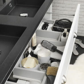 Jak na meble w stylu retro przystało, szafki mają nóżki (choć można z nich zrezygnować) i dekoracyjne gzymsy. Jednak pod względem wyposażenia w niczym nie ustępują nowoczesnym meblom łazienkowym - mają zawiasy i prowadnice z systemem cichego domykania.