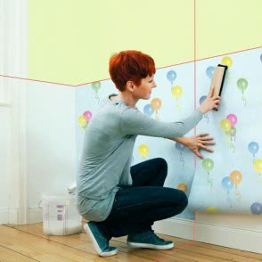 Do tapetowania ustaw laser krzyżowy tak, aby pozioma linia wskazywała wysokość górnej krawędzi arkusza. Linia pionowa pomoże Ci w precyzyjnym przyklejeniu kolejnych pasów tapety. Jeszcze bordiura? Nic prostszego - wystarczy lekko podnieść Quigo, aby przesunąć poziomą linię lasera i wyznaczyć krawędź bordiury.