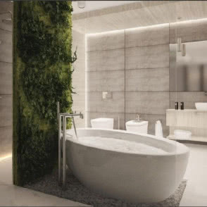 Pierwsze, co widzimy, wchodząc do tej łazienki, to nie toaleta, ale piękny pejzaż, który może być choćby nadrukiem na szkle. Znajdujemy się na blacie, około 75 cm ponad skalistą posadzką łazienki. Blat jest na poziomie podłogi reszty domu i to w nim są zainstalowane elementy ceramiki łazienkowej Roca: umywalki oraz wanna.