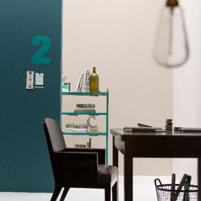 Widać w niej ducha naszych czasów, w których kierunek wyznaczają symbole, znaki, infografiki. Graficzne wskazówki i punkty odniesienia ułatwiają organizację codziennego życia i chronią przed chaosem. Podobnie geometryczna ikona czy typograficzny motyw porządkują wnętrze, jednocześnie dodając mu dynamiki. Trend Margines dowodu nawiązuje do stylistyki biurowej i loftowej, w której surowość materiałów łagodzą dodatki i dekoracje ścienne. Paleta kolorów to zestaw barw neutralnych, błękitów i granatów o nasyconym, męskim charakterze. Dynamiki dodaje dodatek ciemnej ochry i intensywnych czerwieni.
