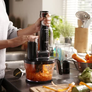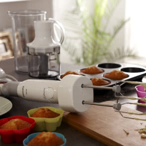 A jest co testować, bo blendery ręczne Philips SpeedTouch mają w wyposażeniu sporo akcesoriów. I tak - w zależności od tego, który model wybierzemy - będzie to rozdrabniacz o 4 ostrzach (idealny do siekania mięsa lub cebuli), trzepaczka, przystawka do purée, mikser i robot kuchenny (malakser).