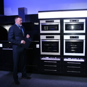 Tym razem widzimy eleganckie piekarniki, mikrofalówki i płyty kuchenne do zabudowy - w białym, beżowym i czarnym szkle. Na uwagę zasługuję zwłaszcza piekarnik z technologią 6. Zmysł, czyli automatyką, która wyręczy nas w ręcznym programowaniu piekarnika. Wystarczy wybrać opcję 6. Zmysł i jeden z 6 rodzajów otraw, a piekarnik automatycznie dobierze temperaturę i czas pieczenia, a także powiadomi nas, kiedy mamy wstawić i wyjąć danie z piekarnika.