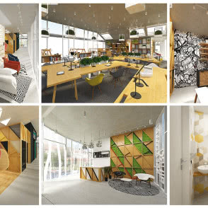 Kolejna nagroda finansowa powędrowała do Moniki Kality i Karola Skowerskiego. W ich projekcie, wnętrze biura idealnie stapia się z istniejącym otoczeniem, nawiązując z nim harmonijny dialog.