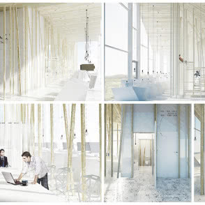 Autorem czwartej wyróżnionej pracy jest Jakub Chojna. Zaprojektował on wnętrze, w którym elementem dominującym jest ciekawa falująca struktura obłożona drewnem, rozpościerająca się nad obrysem centralnego rdzenia.