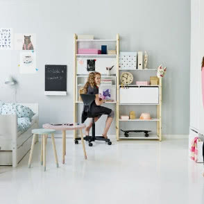 Najlepszym sposobem na unikniecie bałaganu i wizualnego chaosu w pokoju dziecka jest pochowanie czego się da w szufladach i szafach. Wiadomo jednak, że dzieci lubią eksponować swoje ulubione książki, filmy, rysunki czy kolekcje. Modułowe regały Flexa Shelfie pozwalają na jedno i drugie - szeroka oferta szuflad, szafek zamykanych i pudełek ułatwi utrzymanie porządku,a otwarte półki i kasetony pozwolą cieszyć oczy ukochanymi przedmiotami.