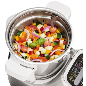 Wyposażenie robota to Robot nóż tnący, nóż do wyrabiania ciasta/kruszenia lodu, przystawka do ubijania, mieszadło oraz koszyk do gotowania na parze. Pojemna misa ze stali nierdzewnej (4,5 l, pojemność robocza - 2,5 l) pozwoli przygotować 6 porcji każdego dania dla całej rodziny.