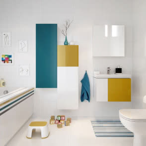Modułowe meble łazienkowe Colour dostępne są w 4 kolorach: morski błękit, słoneczna żółć, a także szare i białe. Mając do dyspozycji taką paletę, stworzysz w swojej łazience oryginalną trójwymiarową dekorację ściany. A gdy się opatrzy - bez problemu przearanżujesz!