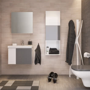 W kolekcji dostępna jest również szafka lustrzana oraz bardzo komfortowa szara lub biała deska sedesowa z duroplastu (można także wybrać wersję wolno opadającą z łatwym wypinaniem).