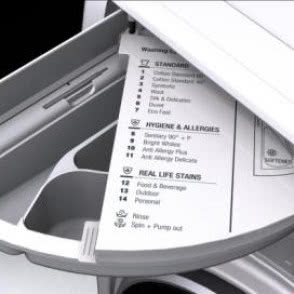 Poza tymi, kluczowymi dla skuteczności prania technologiami, Hotpoint zadbał też o naszą wygodę. Tak więc w szufladce na proszek znajdziemy sprytnie wysuwaną ściągę, która wskaże nam odpowiedni program, temperaturę i pozostałe parametry prania danej tkaniny.