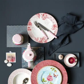 Różowymi i błękitnymi tonami zachwyca także zastawa stołowa Floreana. Śmietankową biel porcelany subtelnie ożywiają akwarelowe kwiaty inspirowane wzorami z miedziorytów i słynnej mozaiki Villeroy & Boch z Mettlach.