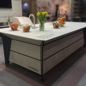 Wyspa z płyt LAMINAM może być oryginalnym punktem wyjścia do stworzenia całej aranżacji kuchni. Może też być designerską "kropką nad i" w ponadczasowych projektach kuchni w neutralnej stylistyce i bezpiecznej kolorystyce. A dzięki temu, że jest mobilna, na lato możemy przenieść ją na taras lub do ogrodu. Zupełnie nie obawiając się o jej trwałość.