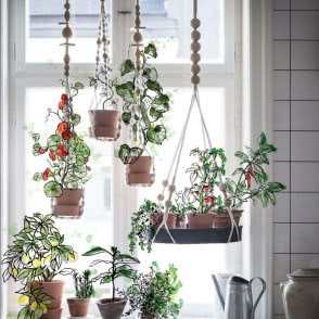 Tak więc w kolekcji ANVÄNDBAR znajdziemy samonawadniające się doniczki, które zapewniają roślinom pobieranie wodę, kiedy są spragnione. Brak ci w domu miejsca na kwiaty? Ławka ze skrzynką na kwiaty i wiszące tace i osłonki na doniczki pomogą zmienić dom w zielony ogród, nie zajmując przestrzeni użytkowej.