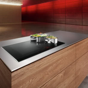 Wybierając płytę grzewczą zwracamy uwagę na funkcjonalność, ale wygląd też się liczy. Projektanci płyty flexInduction zadbali więc o to, by jej wzornictwo sprawdziło się w każdej kuchni. Szeroka na 90 cm płyta z przodu i z tyłu wykończona jest szlifem, a po bokach ma ranty ze stali szlachetnej, które chronią krawędź przed uszkodzeniem, kiedy zsuwamy naczynia z płyty na blat i z powrotem. To rozwiązanie sprawdzi się i w tradycyjnej zabudowie, i na wyspie kuchennej. Uwagę zwraca także czytelny, podświetlony na czerwono panel sterowania.