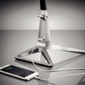 Lampa Leitz Style Smart LED zwraca też uwagę ciekawym designem - podstawa ze szczotkowanego aluminium z ocynkowymi elementami wygląda nowocześnie i stylowo. Dodatkowym udogodnieniem jest umieszczony w podstawie port USB, który ułatwia ładowanie telefonu czy tabletu.