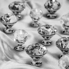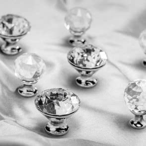 Uchwyty gałkowe ozdobione szlifowanym szkłem pasować będą szczególnie do sypialni, łazienki czy salonu, zwłaszcza do stylizowanej toaletki czy komody, eleganckiego kredensu albo kobiecego schowka na biżuterię i akcesoria.