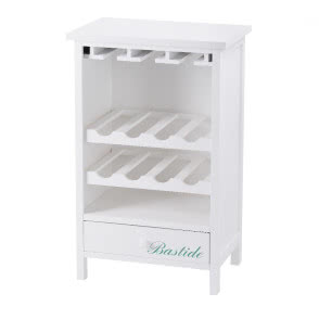 To stylowy mebel, który z pomieści 10 butelek trunku, kieliszki i dodatkowe akcesoria. Szafka wykonana jest z białej płyty MDF i ozdobiona stylizowanym napisem. W tej samej kolekcji znajdziemy też szafkę nocną oraz komodę.