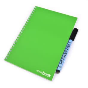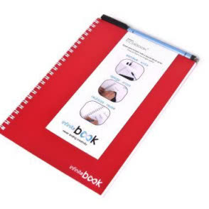 InfiniteBook jest notatnikiem o suchościeralnych niczym białe tablice stronach. Dzięki temu w oka mgnieniu możemy wymazać to, co wcześniej zostało błędnie zapisane - wystarczy delikatnie potrzeć chusteczką, ściereczką, bądź gumką. Nie musimy martwić się skreśleniami, zmazywaniem lub tym, że notatki będą wyglądać nieestetycznie. Do pisania służy cienkopis, przypominający ten, który wykorzystujemy przy pisaniu po białej tablicy. Dostępny jest on w zestawie z notesem. Tusz nie brudzi dłoni oraz się nie rozmazuje, a marker płynnie ślizga się po tablicowej kartce, więc notowanie nim to czysta przyjemność.