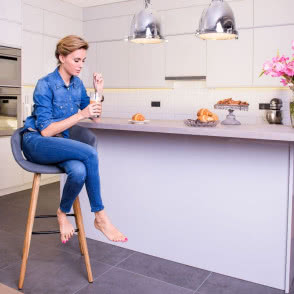 Biel wielu osobom kojarzy się z chłodem, lecz doświadczeni projektanci wnętrz zdają sobie sprawę z tego, że nie jest to sprawiedliwe skojarzenie. Szczególnie w połączeniu z szarością, biel prezentuje się bardzo elegancko i nowocześnie. W kuchni pozwala na dobór dodatków w dowolnych kolorach, jednak Agnieszka Hyży postawiła na klasyczną spójność.