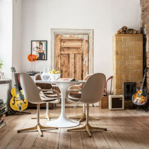 Najpopularniejsze fotele to wzory J. Halabali i rodzimy model 366 J. Chierowskiego. Królową lamp jest PH 4/3 proj. P. Henningsena i oświetlenie z manufaktur Belid i Peill & Putzler. Wśród stolików prym wiodą organiczne “nerki” i “łezki” oraz smukłe “patyczaki”.