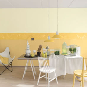 Może marzysz o jadalni, w której poczujesz moc energii od samego rana? Kilka prostych trików i gotowe! Wybierając kolor ścian postaw na orzeźwiające żółcienie, które wprowadzą słońce do pomieszczenia. Zestawienie żywych kolorów Parmesan i Wax nada jadalni wyrazistego charakteru, pobudzając apetyt. Dodatkowy pasek w kolorze Grapefruit namalowany farbą tablicową Tikkurila Liitu pozwoli na przeniesienie artystycznych myśli wprost na ścianę. Wystarczy jeszcze musnąć jadalnię zielenią roślin i przy każdym posiłku w rodzinnym gronie przeniesiesz się do świata relaksującej natury.