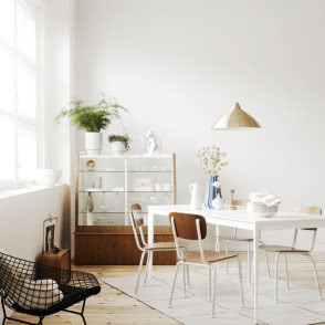 Zwolenników klasycznych wnętrz przekona subtelne połączenie bieli z brązem i delikatnymi dodatkami. Taka kompozycja w jadalni rozświetli całe pomieszczenie i sprawi, że łatwiej nam się będzie rozbudzić podczas śniadania. Klasyczna biel farby Tikkurila Optiva White stworzy łagodne tło dla drobnych elementów dekoracyjnych, zaś zestawienie jasnego stołu z brązowo-białymi krzesłami pozwoli wprowadzić do pomieszczenia świeżość, sprzyjającą zbieraniu energii na dalszą część dnia.