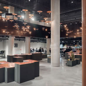 Zwiedzający mają do dyspozycji także sklep i kawiarnie. Znajdują się tam podświetlane gabloty oraz siedziska w kształcie prostych brył. Nad nimi wiszą oprawy oświetleniowe z kloszami w kolorze miedzi. Projektanci zadbali też o pionowe elementy dekoracyjne, poprawiające przy okazji rozchodzenie się dźwięków.
