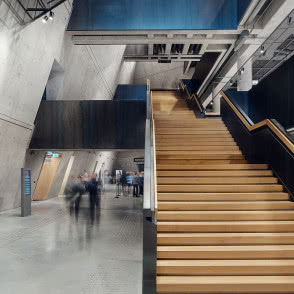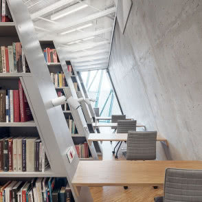 Z podziemi jedziemy wprost na wieżę. Wnętrza są znacznie jaśniejsze od innych poziomów - wpada tu dużo dziennego światła. Ponury grafit został zastąpiony kolorem białym. I choć w niektórych miejscach wciąż widać surowy beton, to jednak zdecydowanie dominuje drewno. Całe piętro jest poświęcone edukacji, w związku z czym nastrój jest już inny - spokojny i łagodny.