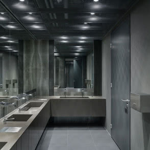W częściach podziemnych zastosowano tylko jeden kolor - grafit. Jest widoczny na obudowach wind, sufitach z siatki cięto ciągnionej i wszystkich innych ciemnych elementach wyposażenia. Toalety są utrzymane w tym samym klimacie. Ich ceramiczne okładziny przypominają spatynowaną blachę i mają militarny wyraz. Projektanci zadbali o komfort zwiedzających, dając im przestrzeń na odetchnięcie i opanowanie emocji. Na poziomie minus 3 biegnie uliczka, gdzie wpada dzienne światło. W każdej chwili można do niej wrócić, odpocząć od zwiedzania, spojrzeć w niebo i odzyskać łączność z teraźniejszością.