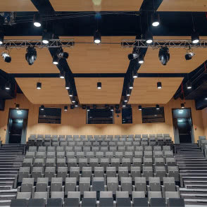 Zaskakująco przytulne jest muzealne audytorium. Zastosowano tu okładziny ścian i sufitów w fornirze dębowym. Scena została przygotowana do przedstawień, a nagłośnienie i oświetlenie pozwala sterować nastrojem wewnątrz pomieszczenia. Nie zabrakło też wygodnych foteli dla widowni.