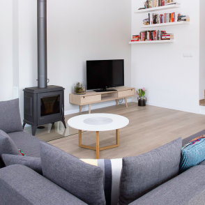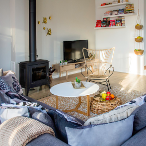 Duża, wygodna, narożna kanapa w grafitowym kolorze stała w centrum pomieszczenia. Naprzeciwko niej znajdowała się tzw. „koza”, która w chłodne wieczory ocieplała całe pomieszczenie. Tuż obok zobaczyliśmy drewnianą półkę pod TV w kolorze buku. Salon oświetlało światło słoneczne wpadające przez przestronne, loftowe okna i lampa vintage po babci.