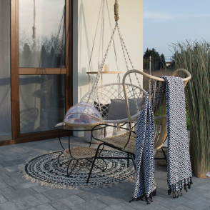 Po metamorfozie salonu przyszedł czas na przemianę tarasu. Wiosna to czas, gdy zaczynamy porządkować naszą przydomową przestrzeń chcąc stworzyć klimatyczne miejsce relaksu w ciepłe wieczory. Tworzenie całej aranżacji projektantka rozpoczęła od powieszenia ażurowej huśtawki. Jej naturalne sznury, frędzle i etniczne sploty pozwoliły na stworzenie afrykańskiego klimatu.