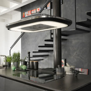 Zamontowany nad blatem okap w kształcie chmury stale monitoruje jakość powietrza. Za pomocą projektora wyświetla na blacie przepisy, dodatkowo podpowiada co możemy ugotować ze składników, które mamy w domu. Okap sterowany jest przez aplikację na smartfona i przy bardzo wysokiej wydajności, jest jednym z najcichszych urządzeń w swojej klasie.