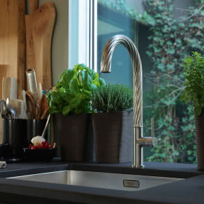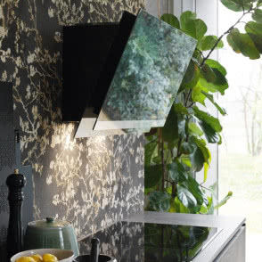 Idee projektanta najlepiej demonstruje okap, który wykończony jest taflą ręcznie formowanego szkła. Jego pofalowana, przypominająca jezioro faktura, za każdym razem przyjmuje trochę inną formę, zatem nie znajdziemy dwóch identycznych egzemplarzy. Sposób sterowania urządzeniem może zaskakiwać, ponieważ panel jest zintegrowany z pofalowaną powierzchnią szkła.