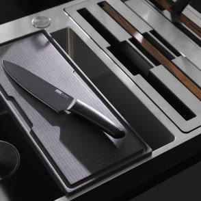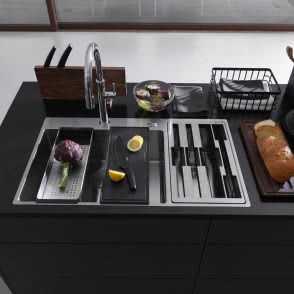 Im więcej urządzeń kuchennych jest dostosowanych do siebie, tym łatwiej jest nam przygotowywać posiłki. Udowadnia to kolejna nowość Franke, czyli Box Center. Łączy on w jedną całość zlewozmywak i miejsce do przechowywania akcesoriów. A wygląda to następująco - obok głównej komory zlewozmywaka znajduje się druga mniejsza. Wsunięty jest w nią elegancki przybornik wykończony stalową ramką. W jego przegrodach znajdują się deski do krojenia, wkładka ociekowa i zestaw noży. Akcesoria idealnie pasują do komory głównej, dzięki temu jej przestrzeń staje się dodatkowym miejscem pracy. Zlewozmywak z modułem na akcesoria ma wymiar 86x51 cm i pasuje do standardowych dolnych szafek o szerokości 90 cm.
