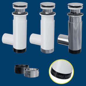 Kolorek? Proszę bardzo. Nowy Easy Clean 40 umożliwia użytkownikom personalizowanie swojego odpływu przez stosowanie kolorowych pierścieni, które dodatkowo mogą być nośnikiem logo. Designerskie pierścienie dostępne są w kolorach: czarny i chromowany. W różnych kolorach występuje także korek click-clack: biały, chromowany, czarny lub złoty brąz. Sitko chromowane, otwarte; korek zwykły - chrmowany. Długa rura przyłączeniowa średnicy 40 mm może być także chromowana bądź biała.
