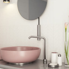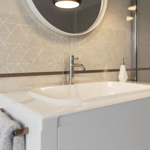 Kolekcja Mistysand oferuje także nowy kształt mozaiki – arabeskę, która łączy w sobie obie kolorystyki z geometrycznym wzorem. Format płytek 30 x 60 cm oraz ich subtelne barwy optycznie powiększą przestrzeń łazienki.
