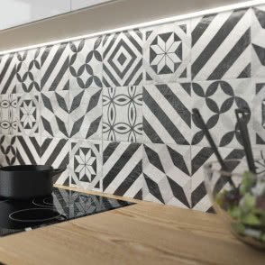 Płytki sprawdzą się na dużych powierzchniach ścian i podłóg, a wyraziste dekory jako patchworkowa dekoracja wybranych elementów przestrzeni.