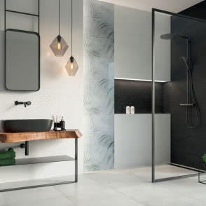 W kolekcji znajdziemy także grafitowe płytki z teksturą omszałego drewna, które znakomicie kontrastują z błyszczącymi płytkami bazowymi w jasnej kolorystyce Ivory oraz Silver. Nawiązanie do natury znajdziemy także w oryginalnej mozaice w kształcie heksagonów.