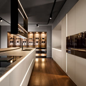 Oto do dyspozycji mamy indywidualnie kontrolowany system oświetlenia biegnącego wertykalnie i horyzontalnie. Światło po raz pierwszy pojawia się też w przestrzeniach między blatem, a frontami. Idealnym dopełnieniem projektu są liczne przeszklenia. Oglądana z oddalenia całość, przywodzi na myśl jubilerskie gabloty. Nowa kuchnia od SieMatic jest elegancka, wręcz biżuteryjnie piękna.