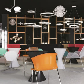 Przy prezentacji różnych modeli lamp szczególnie istotne są forma i rodzaj ekspozycji. W poznańskim showroomie oświetlenie pełni także rolę praktyczną, podkreślając piękno eksponowanych tu krzeseł, kanap czy tkanin, ale też prowadząc klientów do poszczególnych stref. Sama strefa lamp pozwala obejrzeć poszczególne modele z każdej strony, zobaczyć jak rozpraszają światło i jak prezentują się w towarzystwie różnych kolorów czy wzorów.