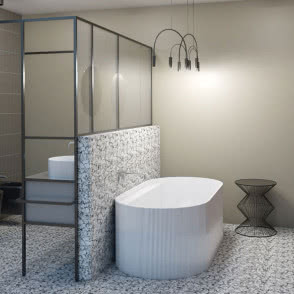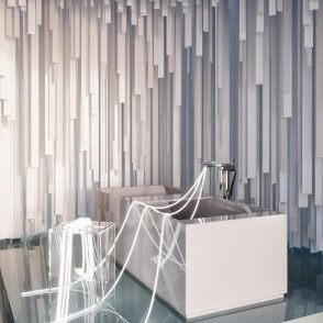 Założeniem projektu jest powściągliwość w aranżacji i zderzenie świata faktur, płynnych linii z taflami prostokątnych ścian i mebli. Inspiracją stały się ryflowane elementy serii Sonar, a motyw rytmicznego zdobienia pojawia się w całym wnętrzu.